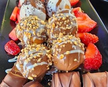 Unsere Tasty Lokma werden direkt vor Ort frisch frittiert und individuell verfeinert – zum Beispiel mit Schokoladen-, Karamell-, Pistazien- oder Buenosoßen, sowie mit verschiedenen Streuseln und frischen Früchten.